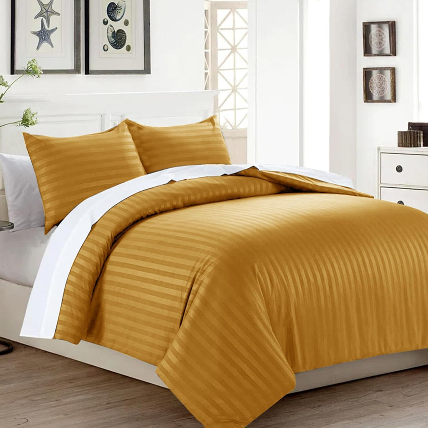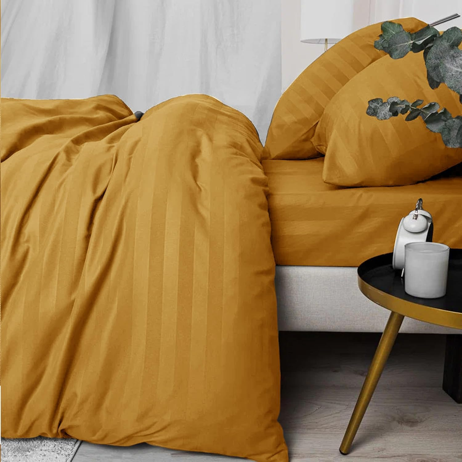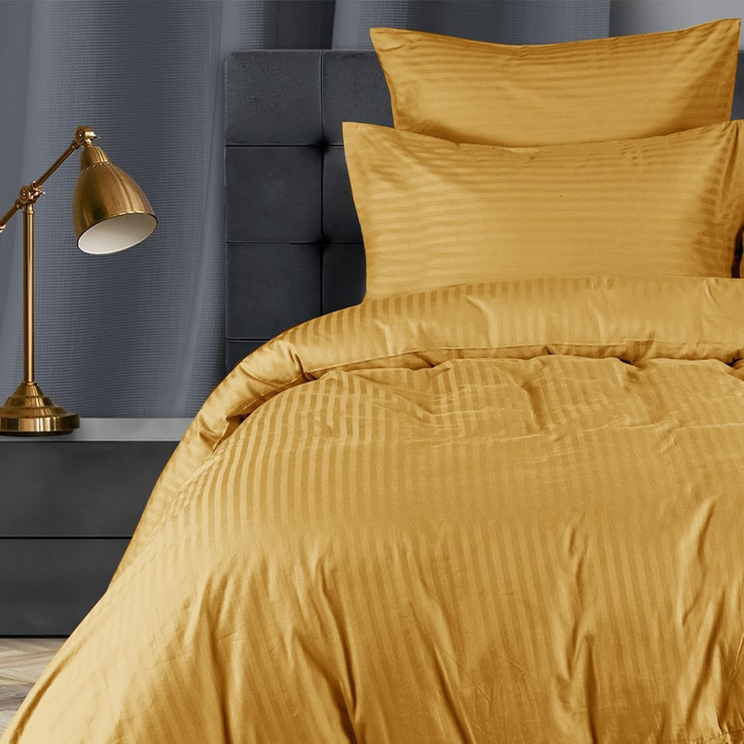 Home Mart Outlet Duvet Cover Sets Double Premium Hotel Quality Brushed Microfiber Satin Stripe Quilt Cover Set with Pillowcases Hypoallergenic Ultra Soft Microfiber (Ochre, Single – 135 x 200 cm)