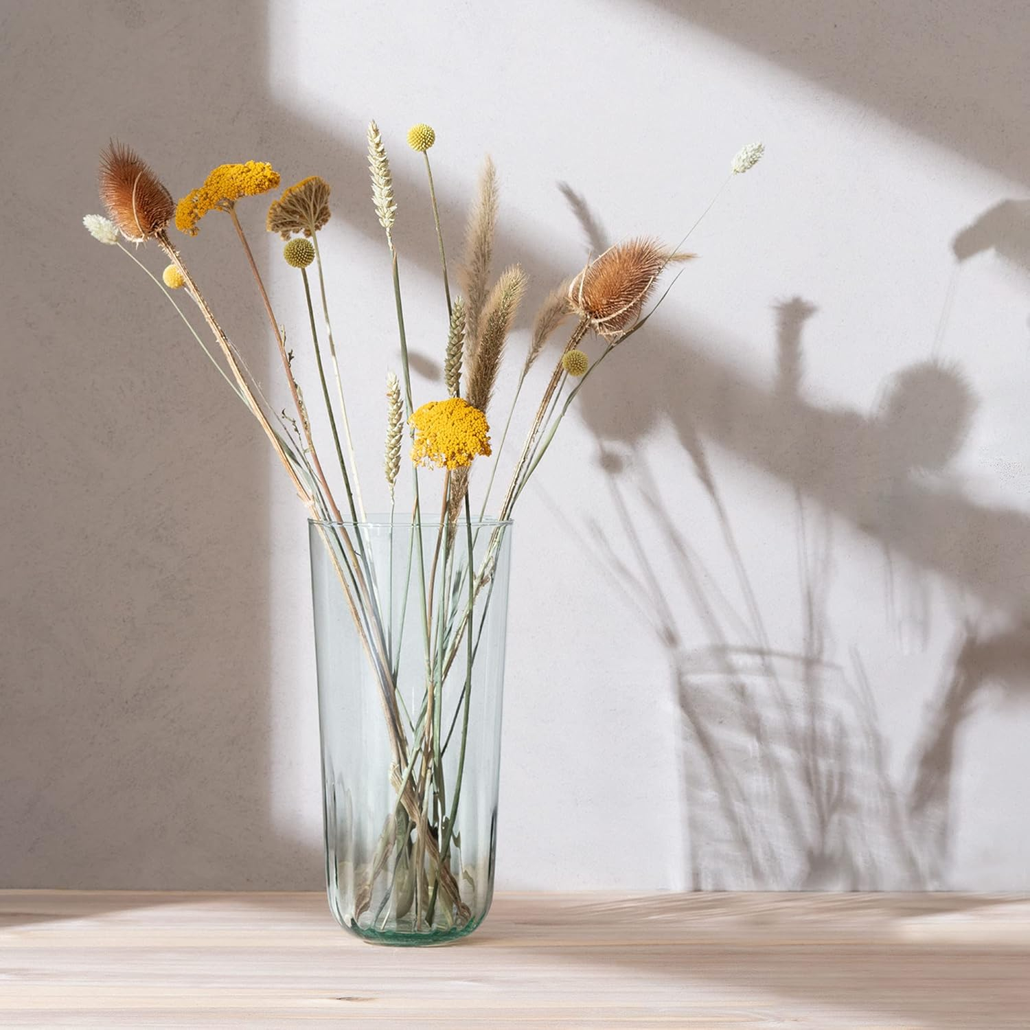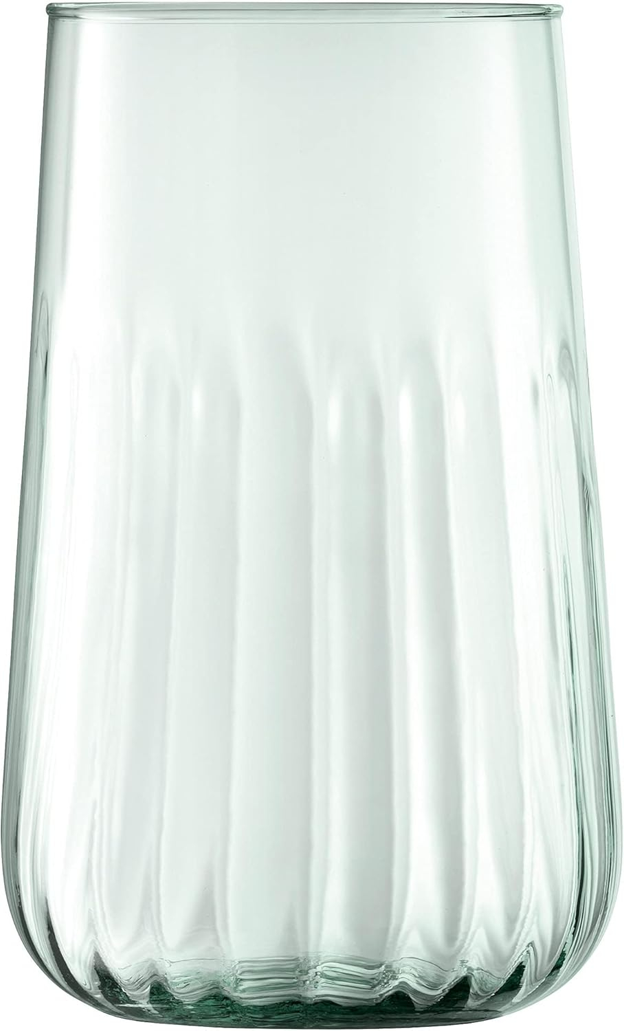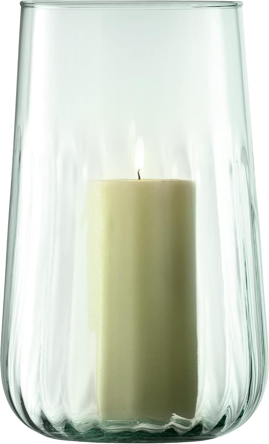 Recycled bottles and jars are crushed and heated until molten, then blown into specially-crafted moulds to create a vase/lantern with a subtly fluted texture.