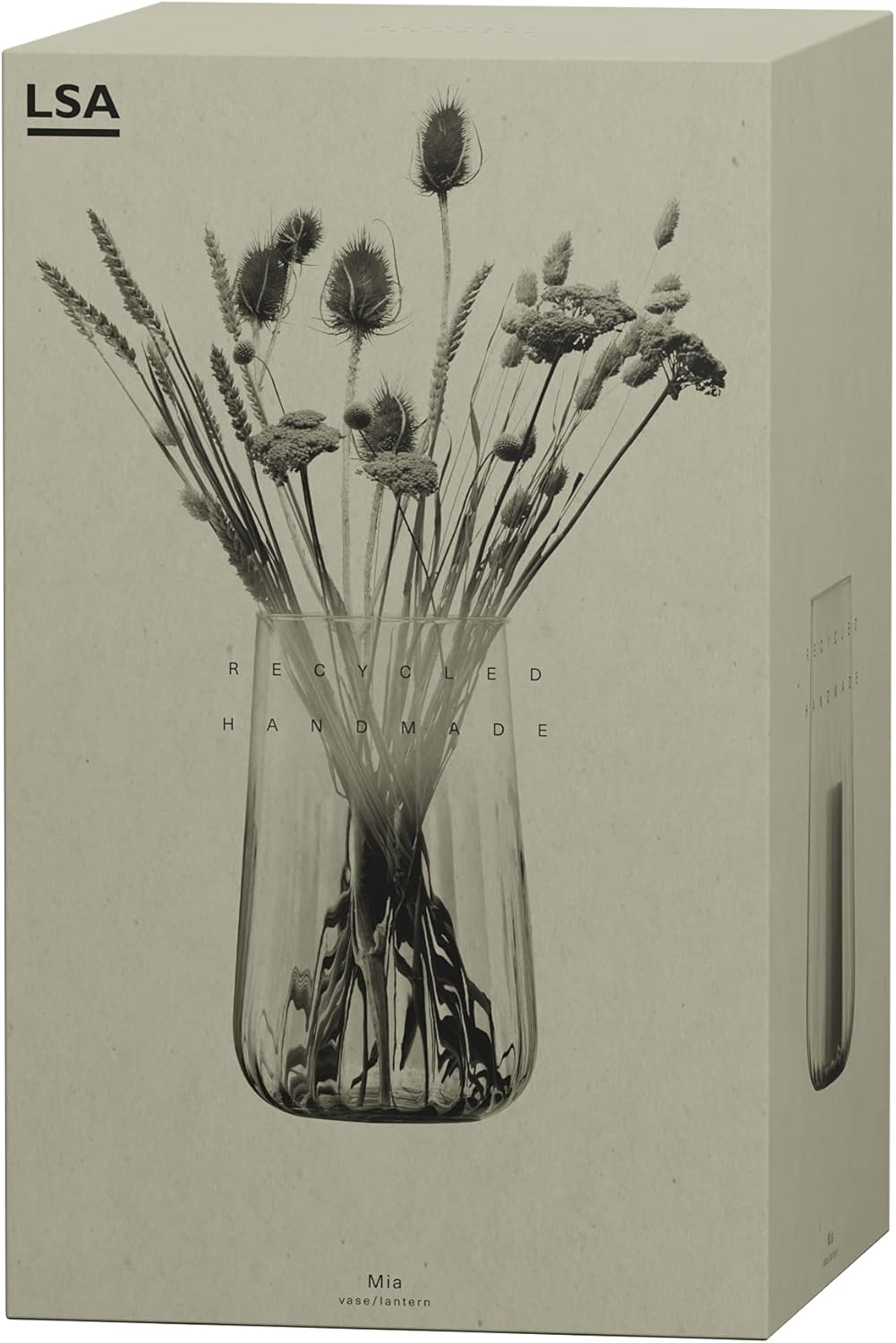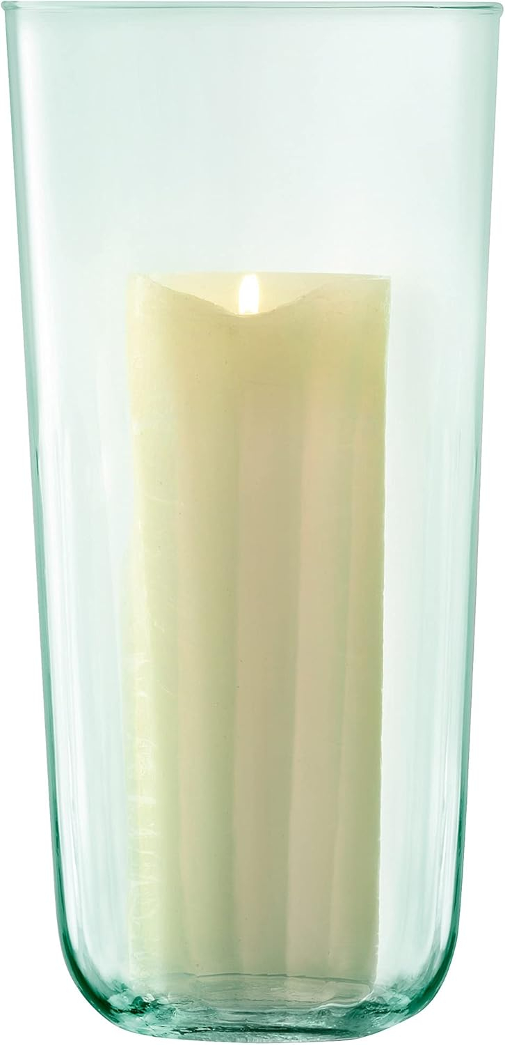 Recycled bottles and jars are crushed and heated until molten, then blown into specially-crafted moulds to create a vase/lantern with a subtly fluted texture.