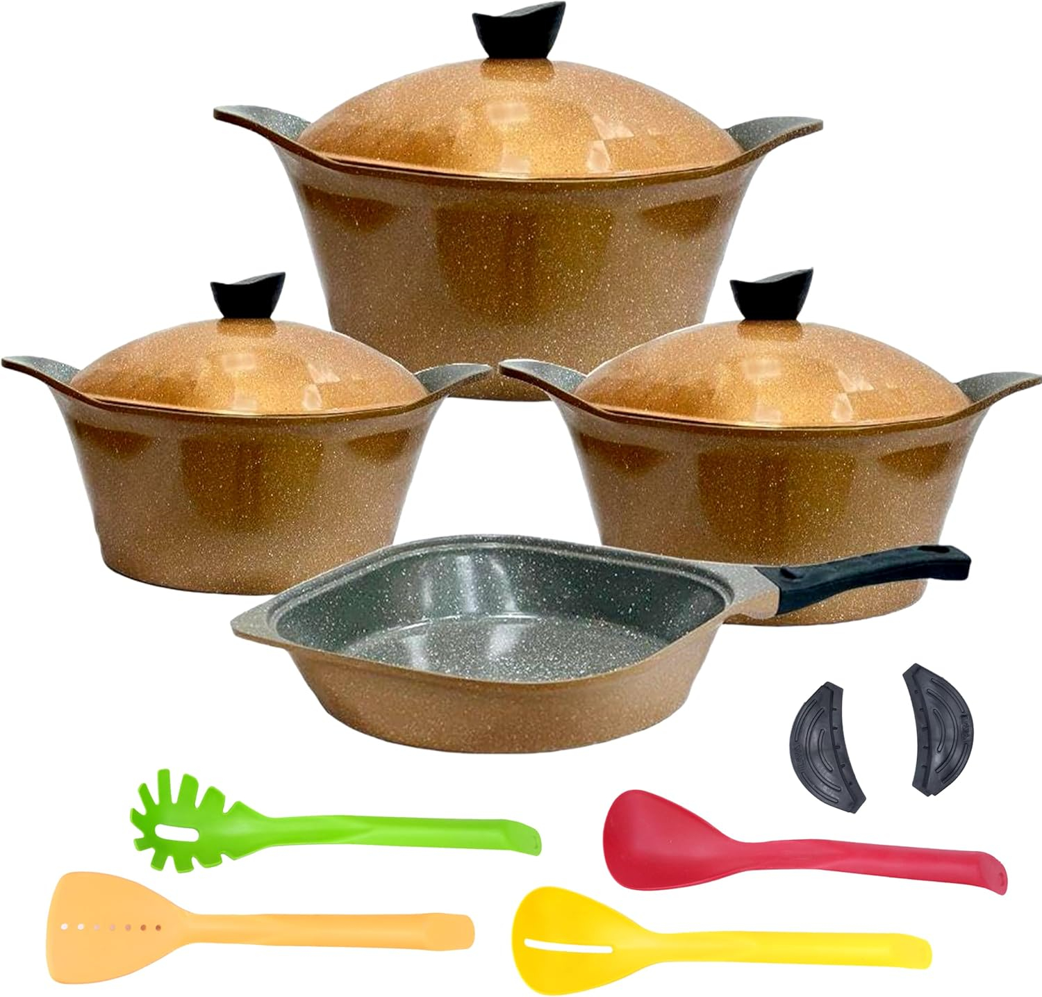 V-SQ-SET13cast aluminum cookware Square set ( 13 ) PCS Single Pot 18+20+24)with lid+(2) Silicone +( Fry Pan 26 CM )+( 4 ) PCS Kitchen Tools non stick korean material colour:copper