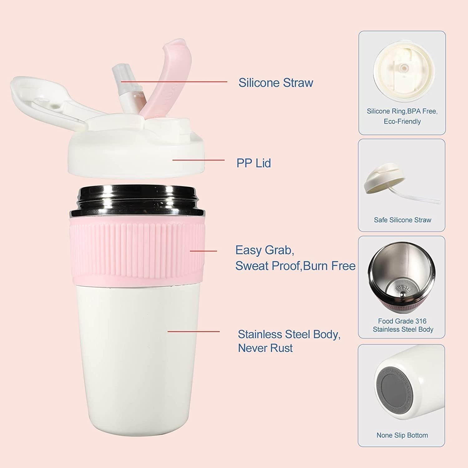 vacuum insulated mug double wall with Portable Lid with straw , BPA Free, Hydro Insulated Thermal Flask for Hot and Cold Drinks 18/8 Stainless Steel Cup 480ML Rapid Lock / Smooth 8 Hours Hot / 20 Hours Cold Colours: pink white